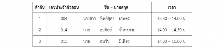 จึงขอแจ้งให้ผู้มีรายชื่อดังกล่าวข้างต้นเข้ารับการสอบสัมภาษณ์ในวันจันทร์ที่ 17 พฤศจิกายน พ.ศ. 2568 เวลา 13.30 – 15.00 น. ณ ห้องประชุม AM 101 ชั้น 1 อาคาร A องค์การกระจายเสียงและแพร่ภาพสาธารณะแห่งประเทศไทย เลขที่ 145 ถนนวิภาวดีรังสิต แขวงตลาดบางเขน เขตหลักสี่ กรุงเทพมหานคร 10210 (โปรดนำบัตรประจำตัวประชาชน และหลักฐานการศึกษาฉบับจริงมาแสดงต่อเจ้าหน้าที่ เพื่อลงทะเบียนก่อนเวลาเข้ารับการสอบสัมภาษณ์ 10 นาที)