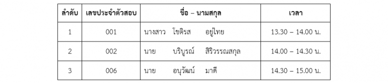 จึงขอแจ้งให้ผู้มีรายชื่อดังกล่าวข้างต้นเข้ารับการสอบสัมภาษณ์ในวันพุธที่ 19 พฤศจิกายน พ.ศ. 2568 เวลา 13.30 – 15.00 น. ณ ห้องประชุม AM 101 ชั้น 1 อาคาร A องค์การกระจายเสียงและแพร่ภาพสาธารณะแห่งประเทศไทย เลขที่ 145 ถนนวิภาวดีรังสิต แขวงตลาดบางเขน เขตหลักสี่ กรุงเทพมหานคร 10210 (โปรดนำบัตรประจำตัวประชาชน และหลักฐานการศึกษาฉบับจริงมาแสดงต่อเจ้าหน้าที่ เพื่อลงทะเบียนก่อนเวลาเข้ารับการสอบสัมภาษณ์ 10 นาที)