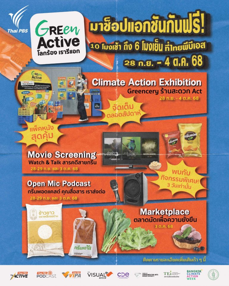 องค์การกระจายเสียงและแพร่ภาพสาธารณะแห่งประเทศไทย (ส.ส.ท.) หรือไทยพีบีเอส โดยศูนย์สื่อสารวาระทางสังคมและนโยบายสาธารณะ หรือ The Active ร่วมกับกรุงเทพมหานคร Just Transitions Incubator (JUTI) คณะนิเทศศาสตร์ มหาวิทยาลัยกรุงเทพ และมูลนิธิสถาบันสิ่งแวดล้อมไทย เชิญชวนประชาชนร่วมเป็นส่วนหนึ่งของการเปลี่ยนแปลงเพื่อโลก ในงาน "Green Active โลกร้อง เรารีแอก" ภายใต้ธีม Climate Action หรือการลงมือทำเพื่อรับมือกับวิกฤตภูมิอากาศ ซึ่งจัดขึ้นระหว่างวันที่ 28 ก.ย. – 4 ต.ค. 68 ณ อาคาร D ชั้น 1 ไทยพีบีเอส ตั้งแต่เวลา 10.00 – 18.00 น. ของทุกวัน
