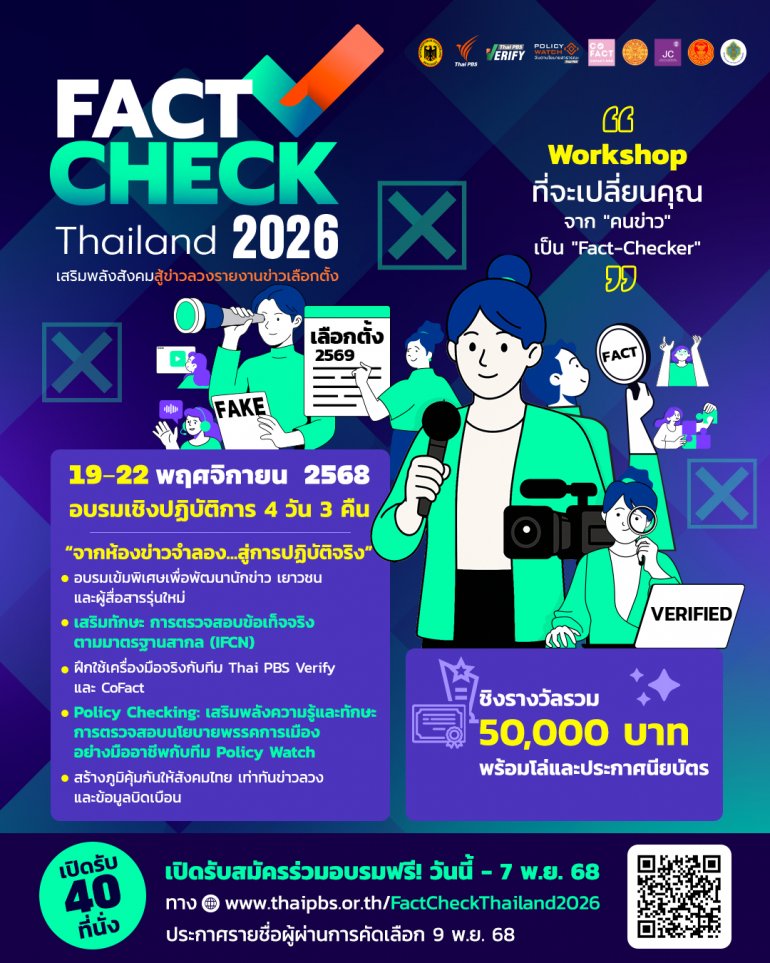 - สมัครได้แล้ววันนี้ – 7 พฤศจิกายน 2568 ทาง www.thaipbs.or.th/FactCheckThailand2026 (รับจำนวนจำกัด 40 คน เท่านั้น)