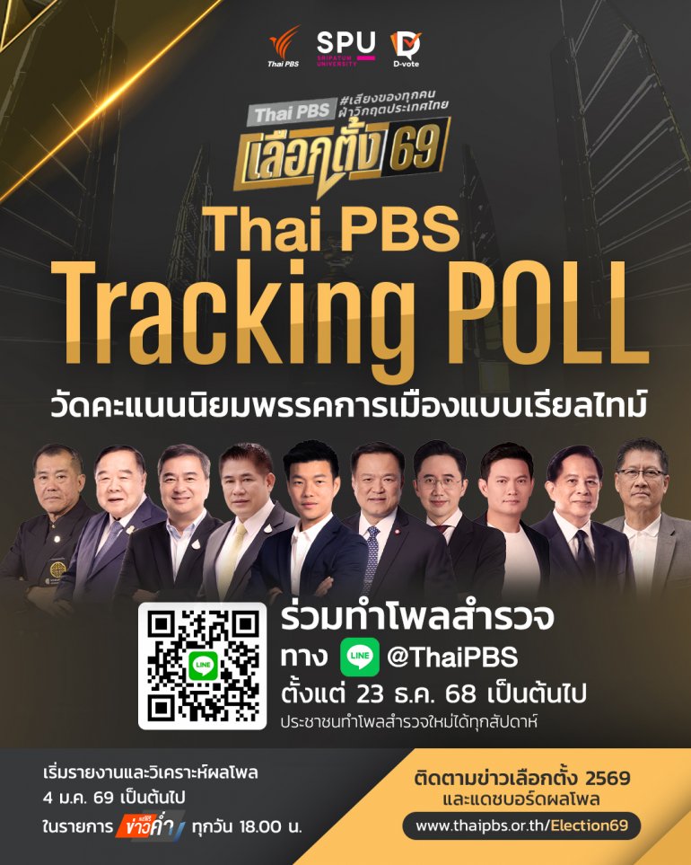 ไทยพีบีเอส ร่วมกับ ศูนย์โพลศรีปทุม-ดีโหวต มหาวิทยาลัยศรีปทุม เปิดพื้นที่รับความคิดเห็น ฟังเสียงสะท้อน และกระแสความสนใจในการเลือกตั้ง 2569 จากประชาชน ผ่านการจัดทำโพลสำรวจ “Thai PBS Tracking POLL” วัดคะแนนนิยมพรรคการเมืองแบบเรียลไทม์ ผ่านแพลตฟอร์มดีโหวต (D-Vote) ตั้งแต่ 23 ธันวาคม 2568 เป็นต้นไป ทาง LINE @ThaiPBS เพื่อยกระดับการมีส่วนร่วมของประชาชน และสร้างฐานข้อมูลสาธารณะที่น่าเชื่อถือสำหรับสังคมไทย