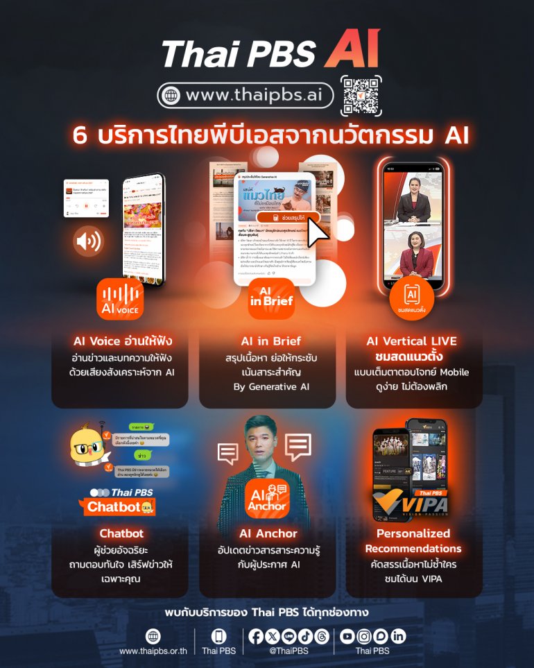 นอกจากนี้ยังได้มีผลิตภัณฑ์และบริการด้าน AI ต่าง ๆ มากมายไปประชาสัมพันธ์ ไม่ว่าจะเป็น AI Voice บริการอ่านให้ฟังจากเสียงสังเคราะห์อัจฉริยะ ที่เพิ่มอัตลักษณ์ด้วยเสียงจากผู้ประกาศข่าวหน้าจอทีวี พร้อมรวบรวม Playlist ที่สร้างขึ้นสำหรับคุณ ติดตามได้ทาง www.thaipbs.or.th/AIAudioNews , AI Anchor อัปเดตข่าว สาระความรู้กับผู้ประกาศข่าว AI ที่มีความสมจริงเป็นธรรมชาติ ภาพและเสียงคมชัด, บริการชมสดเต็มตาไปกับ AI Vertical LIVE ชมสดแนวตั้ง ดูง่ายไม่ต้องพลิก ตอบโจทย์ผู้ใช้งานมือถือ, บริการ Thai PBS Chatbot ผู้ช่วยอัจฉริยะ ถามตอบทันใจ เสิร์ฟข่าวไวถึงมือคุณผ่าน LINE และ Facebook @ThaiPBS และอีกหนึ่งผลิตภัณฑ์ด้านสื่อดิจิทัลเพื่อความบันเทิงครบรส VIPA Personalized Content ที่คัดสรรและแนะนำเนื้อหาเฉพาะคุณ เพียงแค่สมัครสมาชิกใช้งานฟรี VIPA จะเสิร์ฟเนื้อหาที่ใช่ โดนใจคุณ สามารถรับชมเนื้อหาได้ทาง www.VIPA.me หรือ VIPA Application