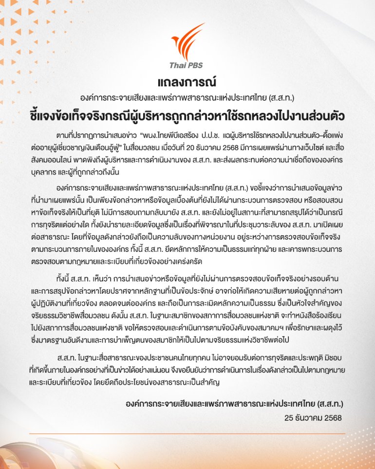 ตามที่ปรากฏการนำเสนอข่าว "พนง.ไทยพีบีเอสร้อง ป.ป.ช. แฉผู้บริหารใช้รถหลวงไปงานส่วนตัว – ดื้อแพ่งต่ออายุผู้เชี่ยวชาญเงินเดือนอู้ฟู่" ในสื่อมวลชน เมื่อวันที่ 20 ธันวาคม 2568 มีการเผยแพร่ผ่านทางเว็บไซต์ และสื่อสังคมออนไลน์ พาดพิงถึงผู้บริหารและการดำเนินงานของ ส.ส.ท. และส่งผลกระทบต่อความน่าเชื่อถือขององค์กร บุคลากร และผู้ที่ถูกกล่าวถึงนั้น